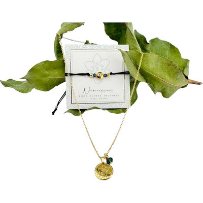Schöne Geburtsblumen Kette für alle die im Dezember Geburtstag haben. Die Geburtsblume ist die Narzisse und zu den Glückssteinen zählt der Zirkon, hierfür hängt ein Swarovski Kristall in dieser Farbe neben dem Edelstahl Anhänger. Ein tolles, individuelles Geschenk, nicht nur zum Geburtstag!