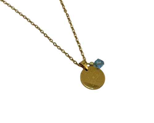 Schöne Geburtsblumen Kette für alle die im März Geburtstag haben. Die Geburtsblume ist die Osterglocke und zu den Glückssteinen zählt der Aquamarin, hierfür hängt ein Aquamarin farbener Swarovski Kristall neben dem Edelstahl Anhänger. Ein tolles, individuelles Geschenk, nicht nur zum Geburtstag!