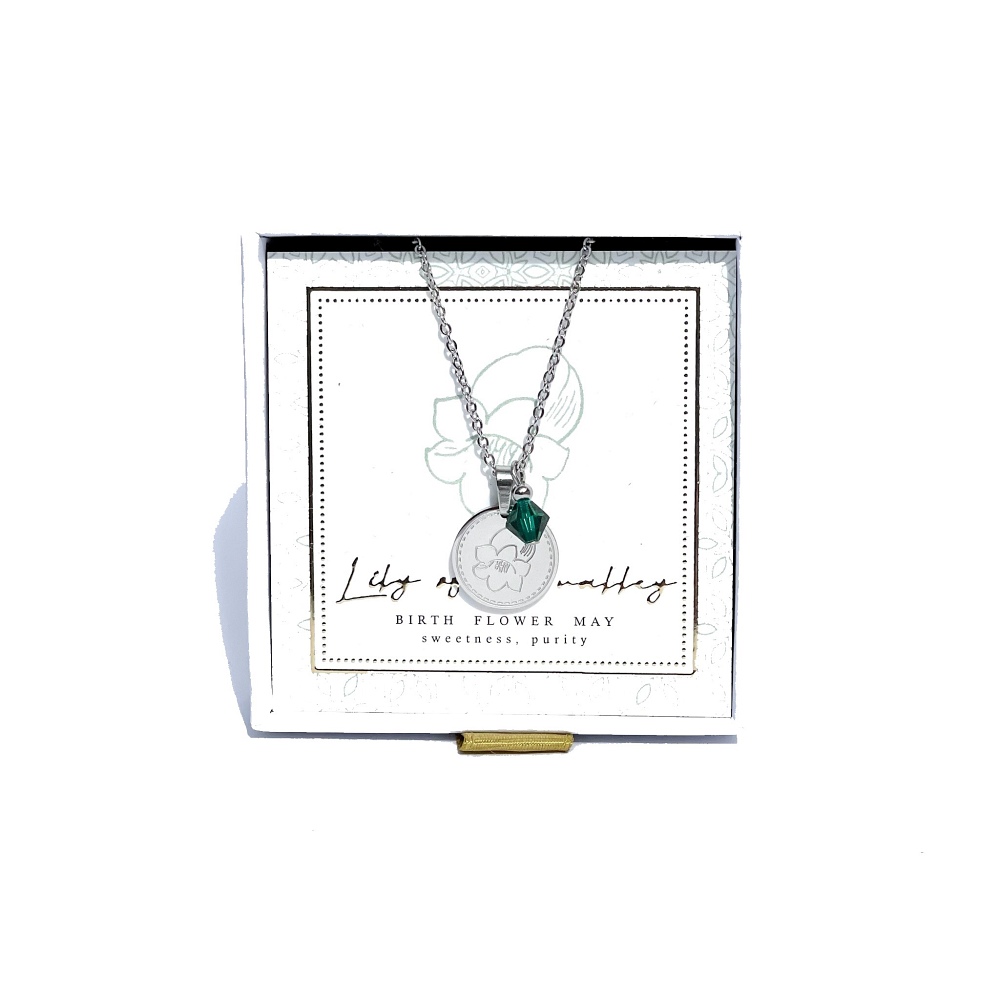 Schöne Geburtsblumen Kette für alle die im Mai Geburtstag haben. Die Geburtsblume ist das Maiglöckchen und zu den Glückssteinen zählt der Smaragd, hierfür hängt ein Smaragd farbener Swarovski Kristall neben dem Edelstahl Anhänger. Ein tolles, individuelles Geschenk, nicht nur zum Geburtstag!